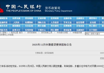 网络 2025-11-24 17:09:14 市场资讯 2025-11-24 17:09:14 阅读 2025年11月中期借贷便利招标公告 为保持银行体系流动性充裕,2025年…