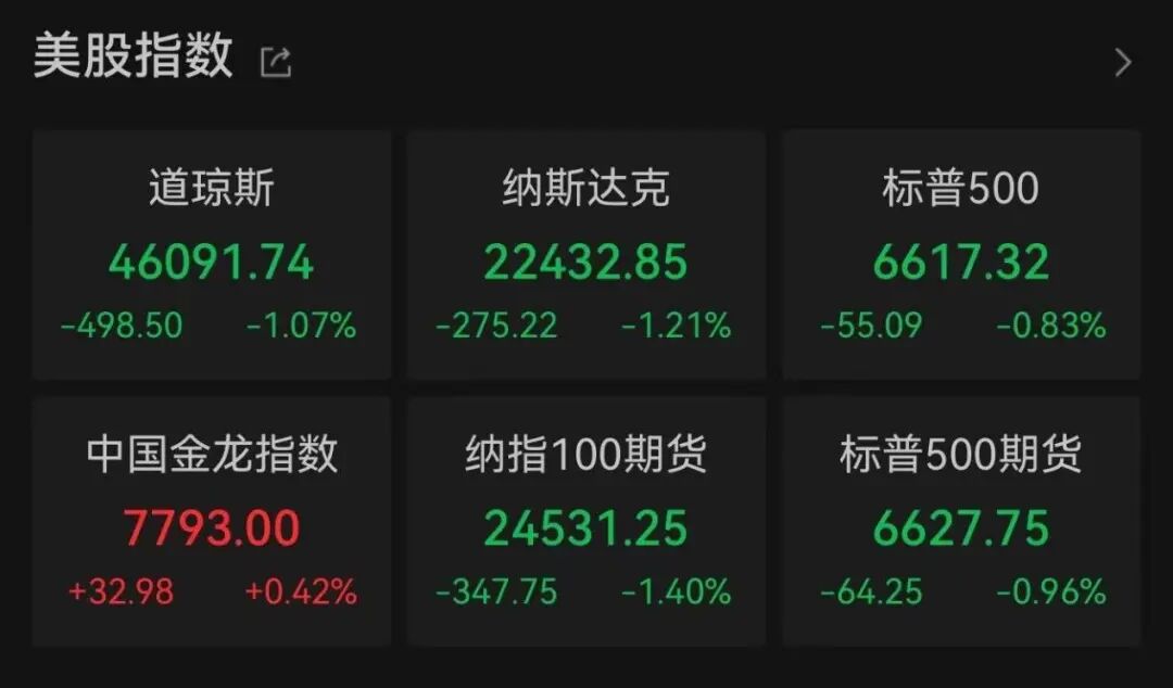 截至收盘,道琼斯指数下跌1.07%,报46,091.74点;标普500指数下跌0.83%,报6,617.32点;纳斯达克指数下跌1.21%,报22,432.85点。