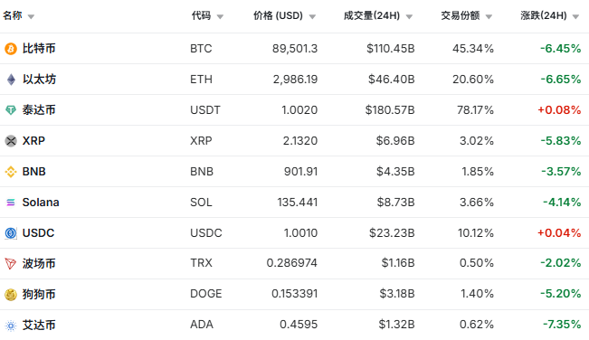 今日盘中,加密货币集体大跳水,24小时内,比特币跌幅超过6%并跌破9万美元,为近七个月来首次,抹去了今年以来的所有涨幅;以太坊跌超6%并跌破3000美元;XRP、Solana、艾达币等纷纷跟跌。截至券商中国记者发稿时,比特币报8.95万美元,24小时内跌幅为6.45%;以太坊下跌6.65%,报2986美元;艾达币跌超7%,XRP跌近6%,Solana跌超4%,BNB跌超3%。