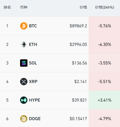 比特币跌破9万美元,以太坊跌超6%,狗狗币跌超4%,过去24小时,全市场超18万人爆仓,数字货币市场波动剧烈。