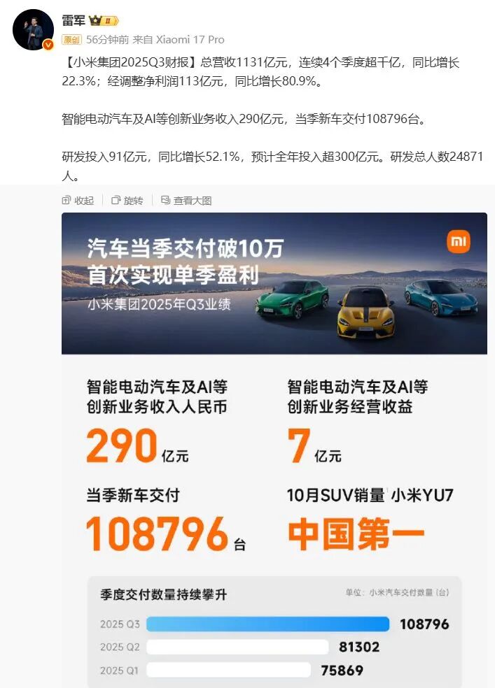 11月18日,小米集团(01810.HK)发布业绩公告显示,2025年第三季度实现营收约1131.21亿元,同比增长22.3%,连续4个季度突破千亿元,这一业绩表现凸显了小米集团强劲的增长势头;经调整净利润为113亿元,创历史新高,同比增长80.9%。