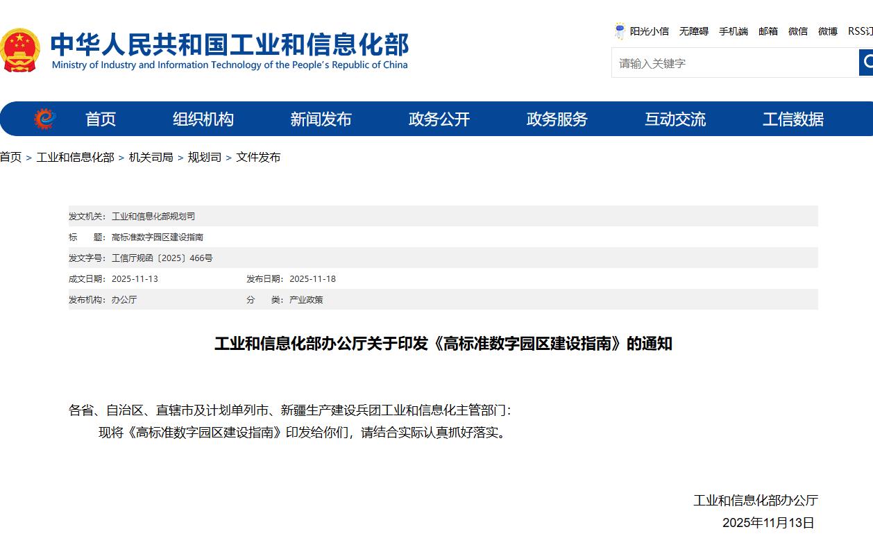 11月18日,工业和信息化部办公厅印发《高标准数字园区建设指南》。该指南聚焦数字园区建设,锚定实现新型工业化这个关键任务,以数字技术与园区发展深度融合为主线,以园区产业数字化转型为重点,协同推进园区服务数字化、管理数字化,夯实数字基础设施,提升园区发展质量,为加快推进新型工业化、建设现代化产业体系提供有力支撑。到2027年,建成200个左右高标准数字园区,实现园区规上工业企业数字化改造全覆盖,园区管理、服务数字化水平明显提升,形成一批可复制可推广的数智赋能园区发展的典型模式,园区发展质量和效益显著提升。