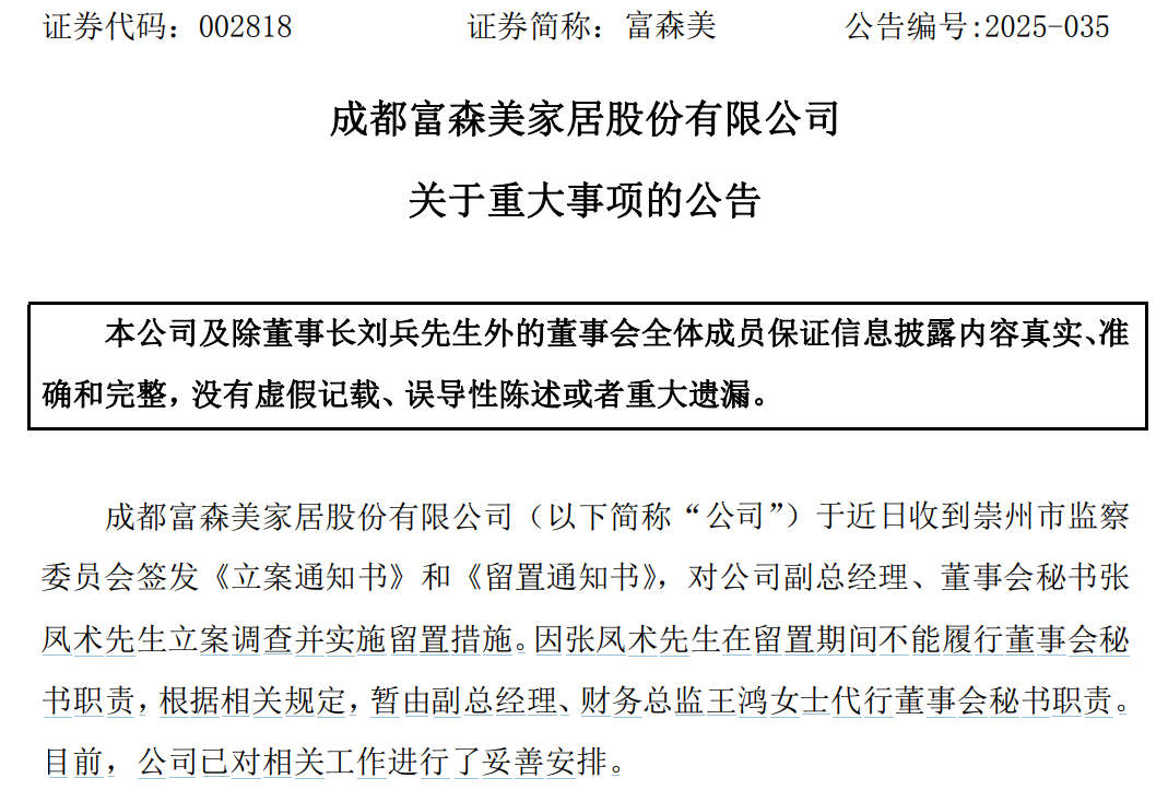 7月24日晚间,富森美公告称,公司近日收到成都市郫都区监察委员会签发的关于公司董事长刘兵被留置的通知书。
