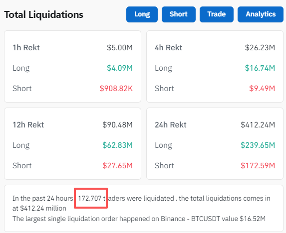 由于剧烈震荡,据CoinGlass数据显示,近24小时内,加密货币共有超17万人爆仓,比特币价格波动引发市场高度关注。