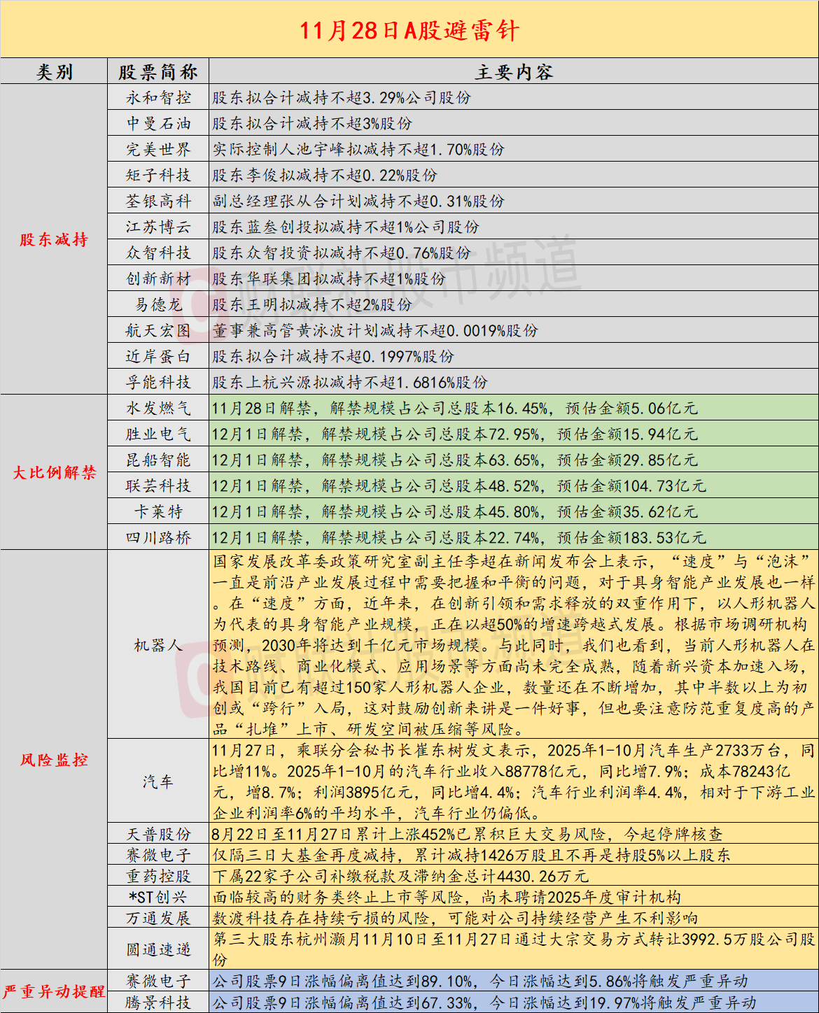 导读:近日,A股及海外市场潜在风险事件如下。国内经济信息方面,国家发展改革委政策研究室副主任李超表示要注意防范重复度高的人形机器人产品“扎堆”上市;乘联会崔东树发文称,汽车行业利润率仅4.4%,仍相对偏低。公司方面,天普股份因累计上涨452%已停牌核查,赛微电子被大基金再度减持。海外市场方面,机构称美元可能在2026年因美联储的降息而下跌;汇丰预计OpenAI到2030年仍难以盈利。此外,还有其他公司预警和海外预警信息。