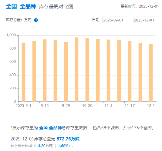 钢银电商最新数据显示,截至12月1日的一周,全国38个城市,共计135个仓库的城市钢材总库存量为872.76万吨,较上周环比减少14.20万吨(-1.60%)。