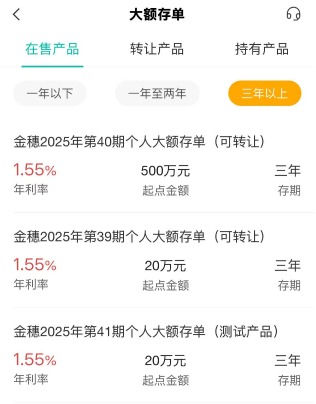 “大额存单每周一到周五9点半开售。”工商银行工作人员称。当天,根据工商银行App,3年期大额存单分为100万元起存、20万元起存两款产品,前者当前已售罄,后者剩余额度大于1000万元。