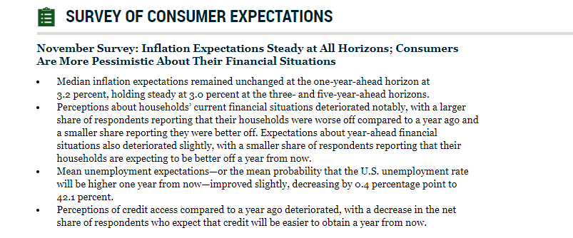纽约联储的调查显示,11月的通胀预期方面整体温和:一年期通胀预期维持在3.2%;三年期和五年期预期均维持在3%不变。