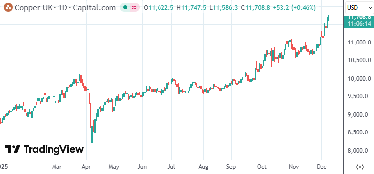 具体行情显示,周一(12月8日)欧洲时段,伦敦金属交易所(LME)铜期货价格一度涨1.5%至每吨11771美元,突破了前一交易日11705美元的历史高位。