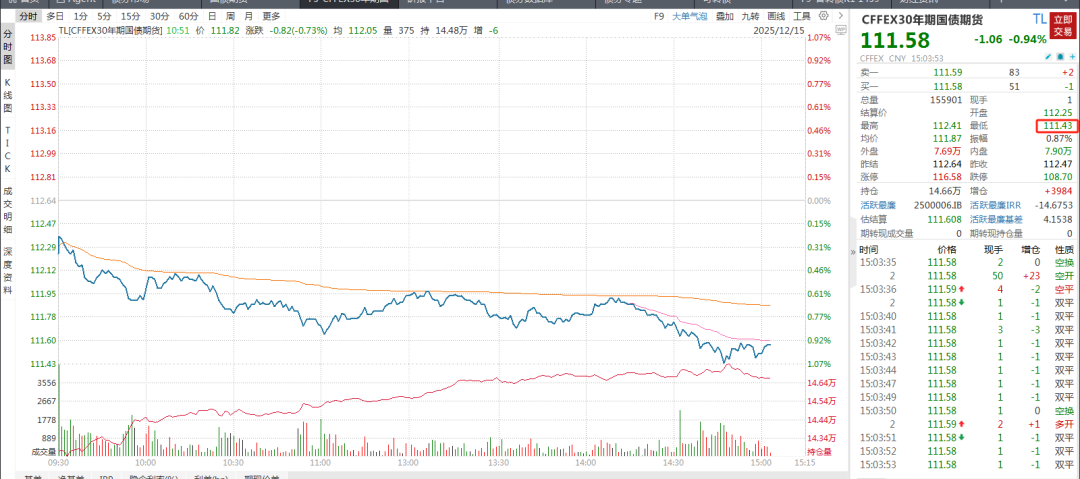 临近年末,债市表现得似乎不太平静。12月12日,30年期国债期货主力合约跌0.71%,12月15日开盘后30年期国债期货主力合约继续走低,盘中一度跌超1%,最低跌至111.43元,刷新本轮调整以来新低。