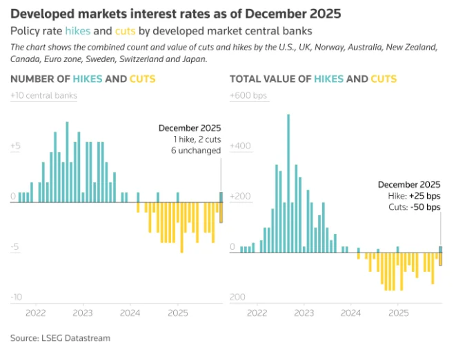 在全球十大最活跃货币的G10央行中,有九家在2025年下调了基准利率。G10央行涵盖了美联储、欧洲央行、英国央行、澳洲联储、新西兰联储、加拿大央行、瑞典央行、挪威央行和瑞士央行。
