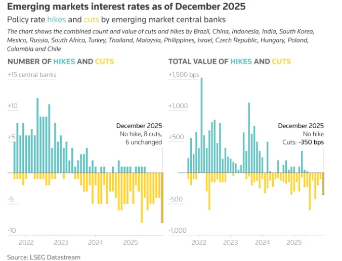 年底的这轮降息浪潮使2025年新兴经济体累计降息幅度达3085个基点(共51次行动),远超2024年的2160个基点,创下至少2021年疫情以来最大的宽松力度。