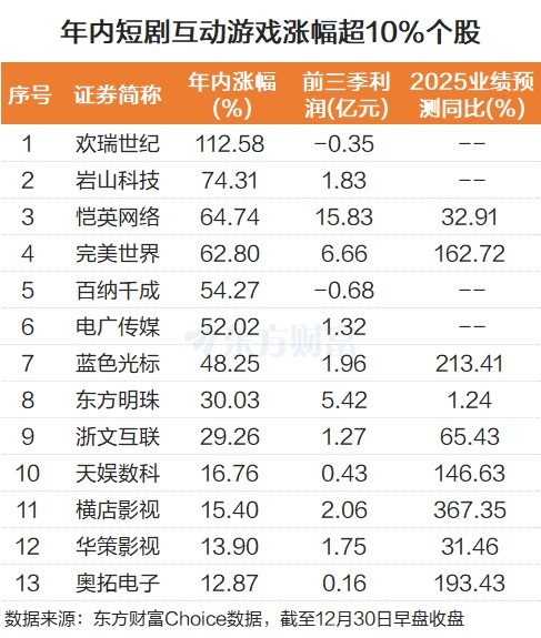 在这样的背景下,年内短剧互动游戏概念整体强势,截至12月30日早盘结束,年内累计涨幅为15.46%。其中欢瑞世纪年内股价翻倍,上涨了112.58%。岩山科技、恺英网络、完美世界、百纳千成、电广传媒也涨幅靠前,年内均超50%。