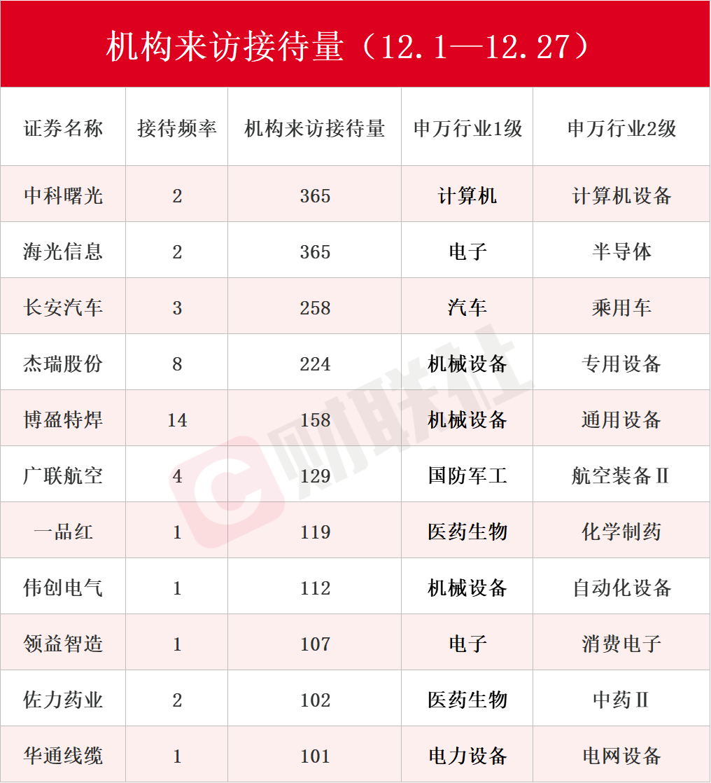 按机构来访接待量统计,中科曙光、海光信息、长安汽车等位列前十。前三名机构来访接待量分别达365家、365家和258家。具体详见下图: