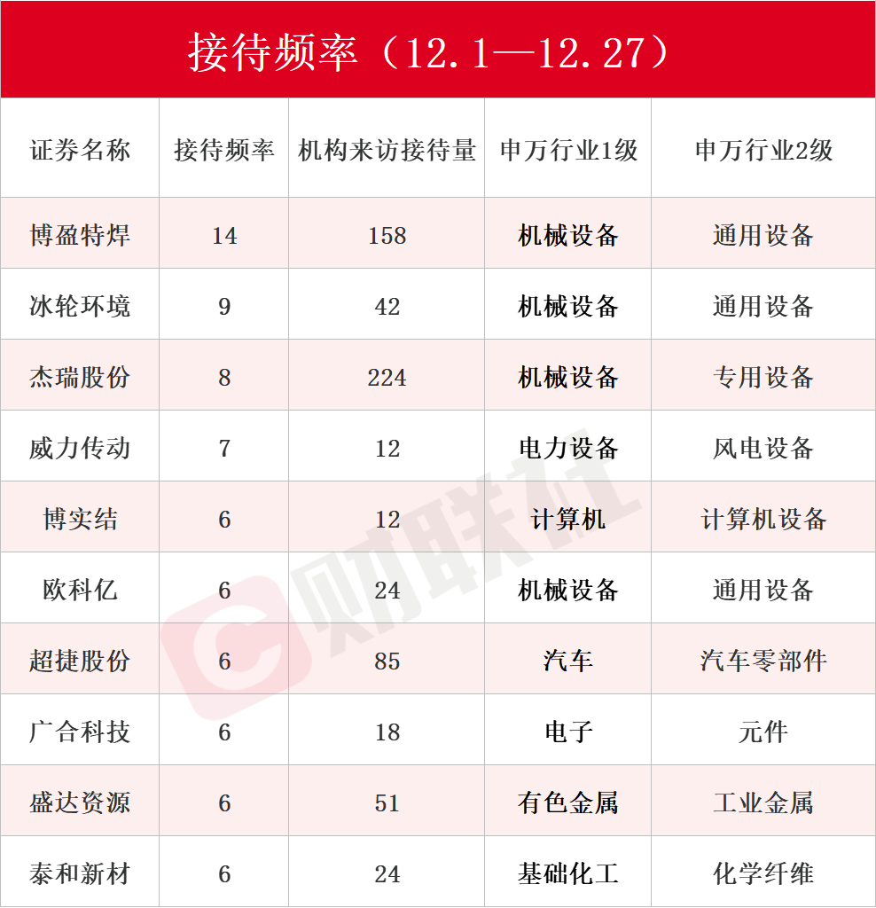 据Choice数据统计,截至发稿,沪深京三市12月(12.1-12.27)共有745家上市公司接受机构调研。接待机构调研次数最多的上市公司是博盈特焊达14次,冰轮环境位列第二,接待次数为9次。具体详见下图: