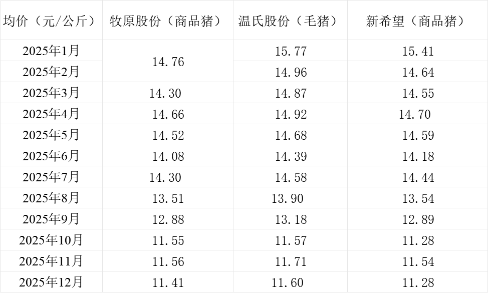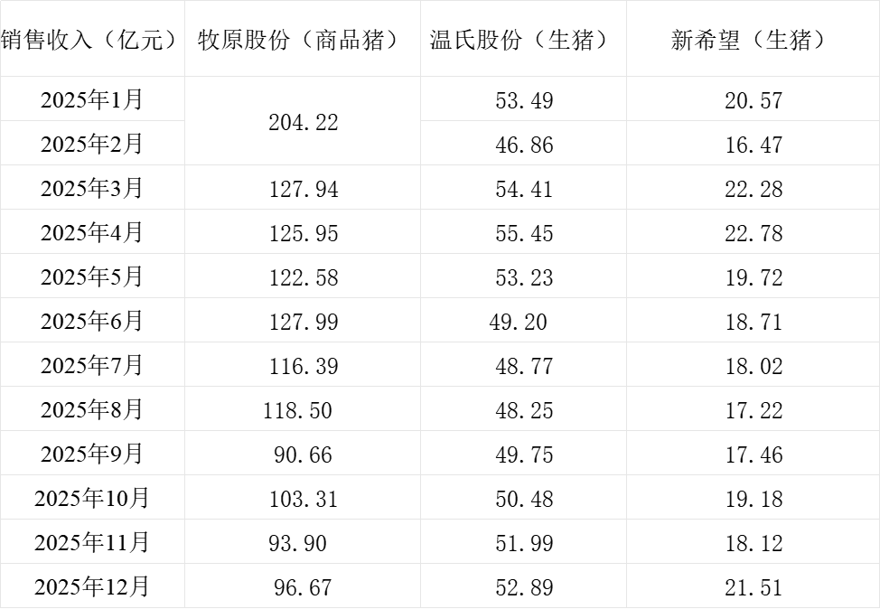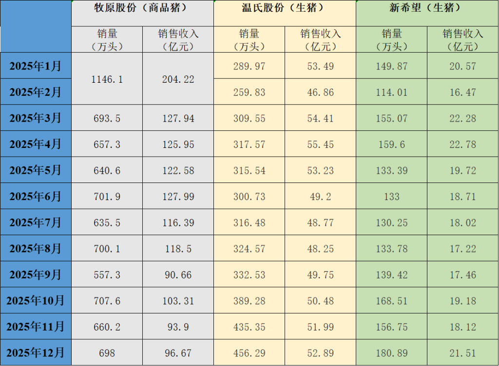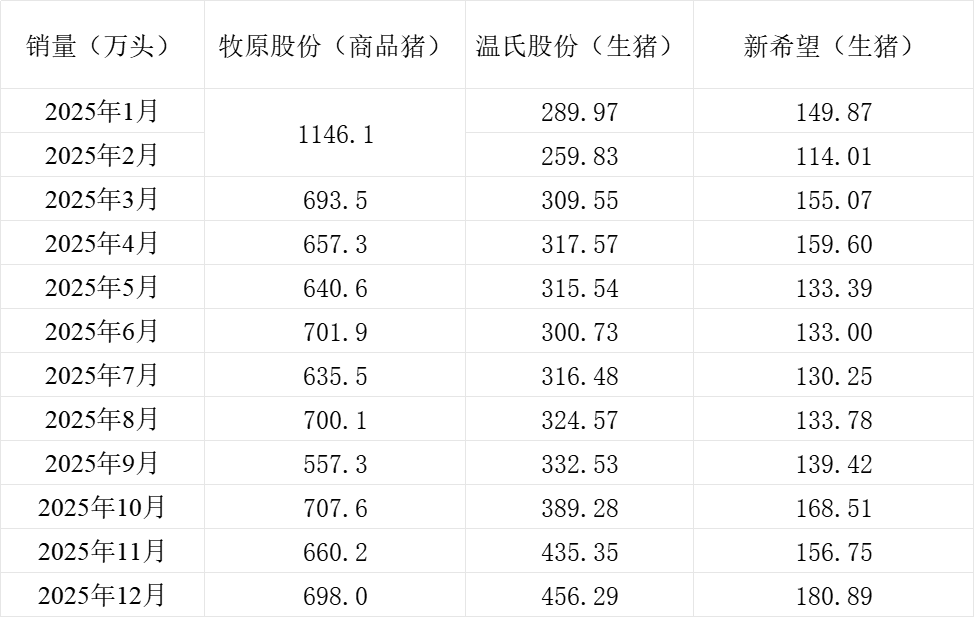 三大上市猪企牧原股份(002714.SZ)、新希望(000876.SZ)、温氏股份(300498.SZ)近日发布2025年12月生猪销售情况。