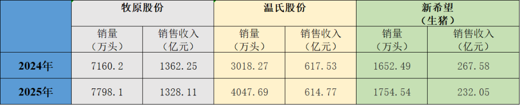 与2024年全年相比,2025年三大上市猪企销量均增长,销售收入均下降。